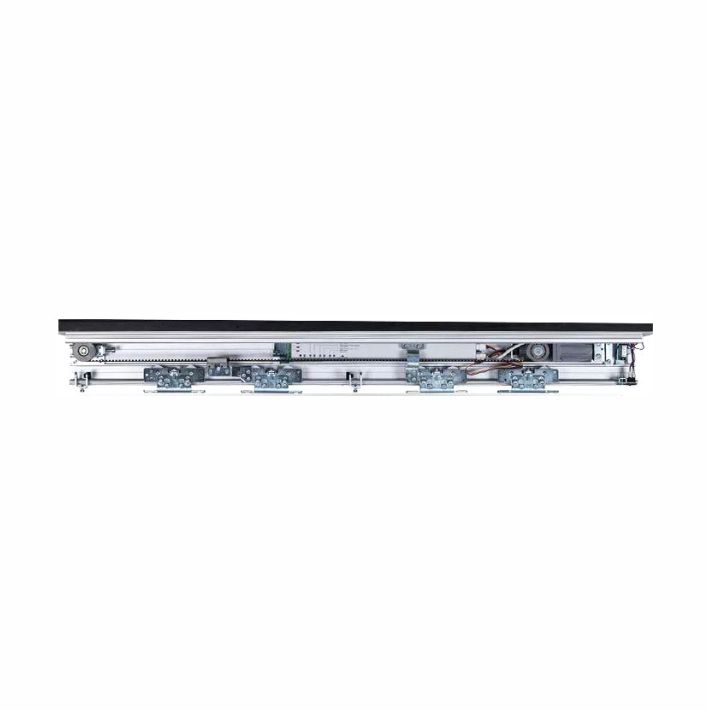 Set automatike za dvokrilna klizna automatska vrata: aluminijumska greda sa poklopcem 4,2m , kontrolna jedinica, brushless motor, dva mikrotalasna senzora, fotoćelije, dva daljinska upravljača sa risiverom, dva para nosećih kolica, štelujuću remenicu, stoper, montažne elemente