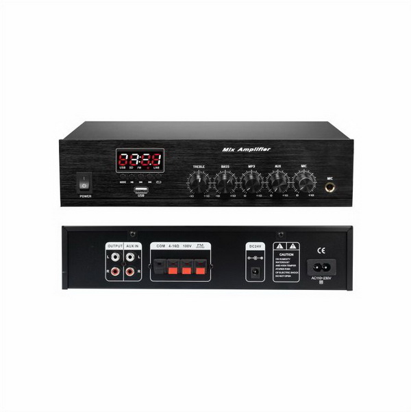 Pojačalo snage 60W za primenu u 100V PA sistemima. Poseduje integrisan FM tjuner, bluetooth prijemnik, audio MP3 plejer sa USB čitačem. 3 izlazne zone sa posebnim podešavanjem nivoa. Tonska kontrola niskih i visokih tonova. Prioritetni mikrofonski ulaz na prednjem panelu. Nezavisna kontrola nivoa jačine za AUX / MIC. Zaštita od preopterećenja i kratkog spoja, termička zaštita.